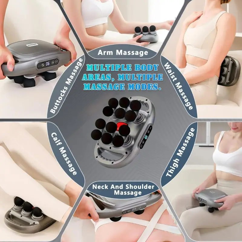 12-Head Massage Gun Deep Tissue: Equipped with 12 highly flexible massage heads, it offers a widermassage surface, easily accommodating various body parts, including the lower back, legs, and solesof the feet. This massage gun effectively relieves muscle tension caused by lifting heavy objects ormaintaining a single position for extended periods, satisfying your overall relaxation needs